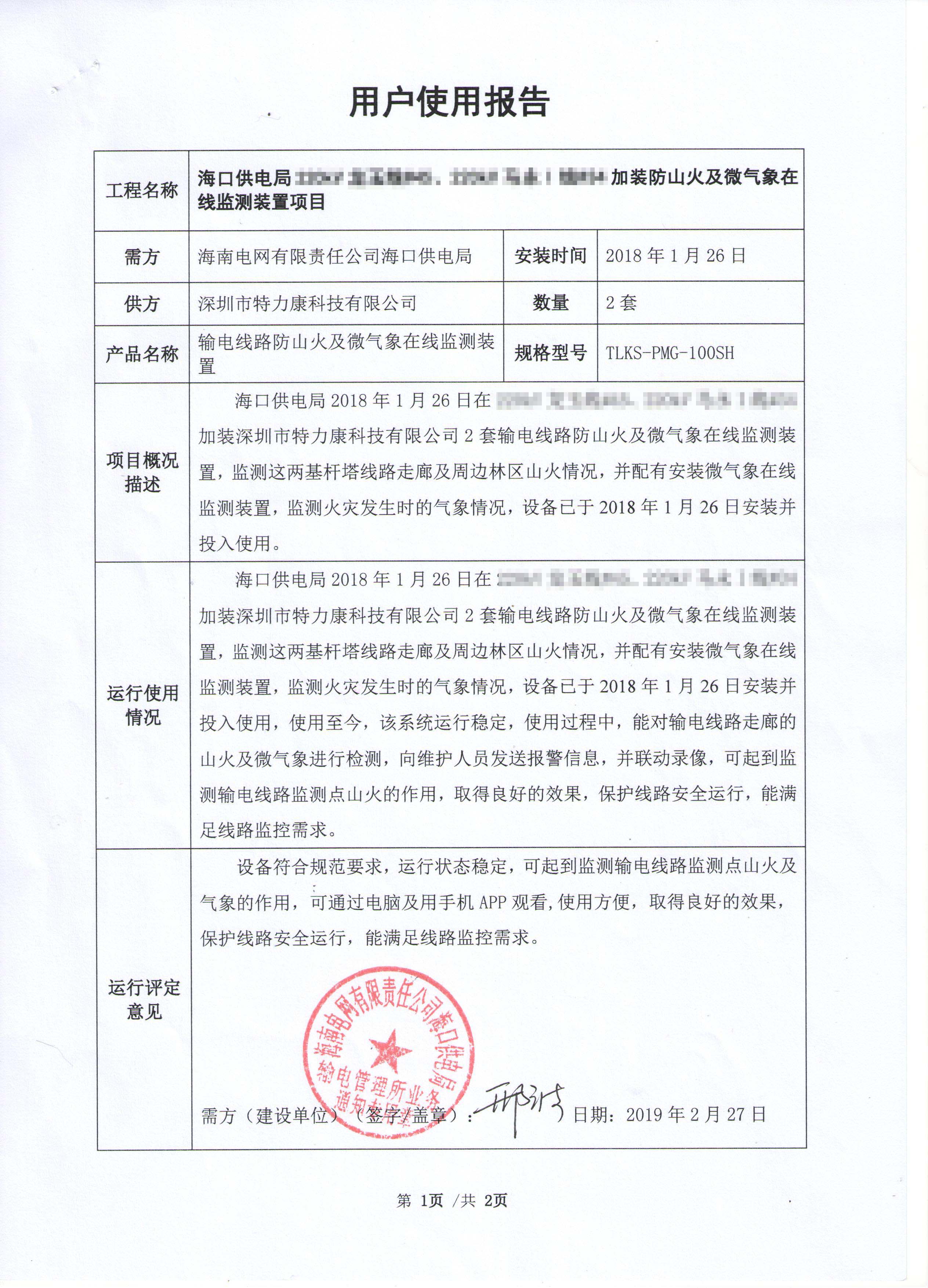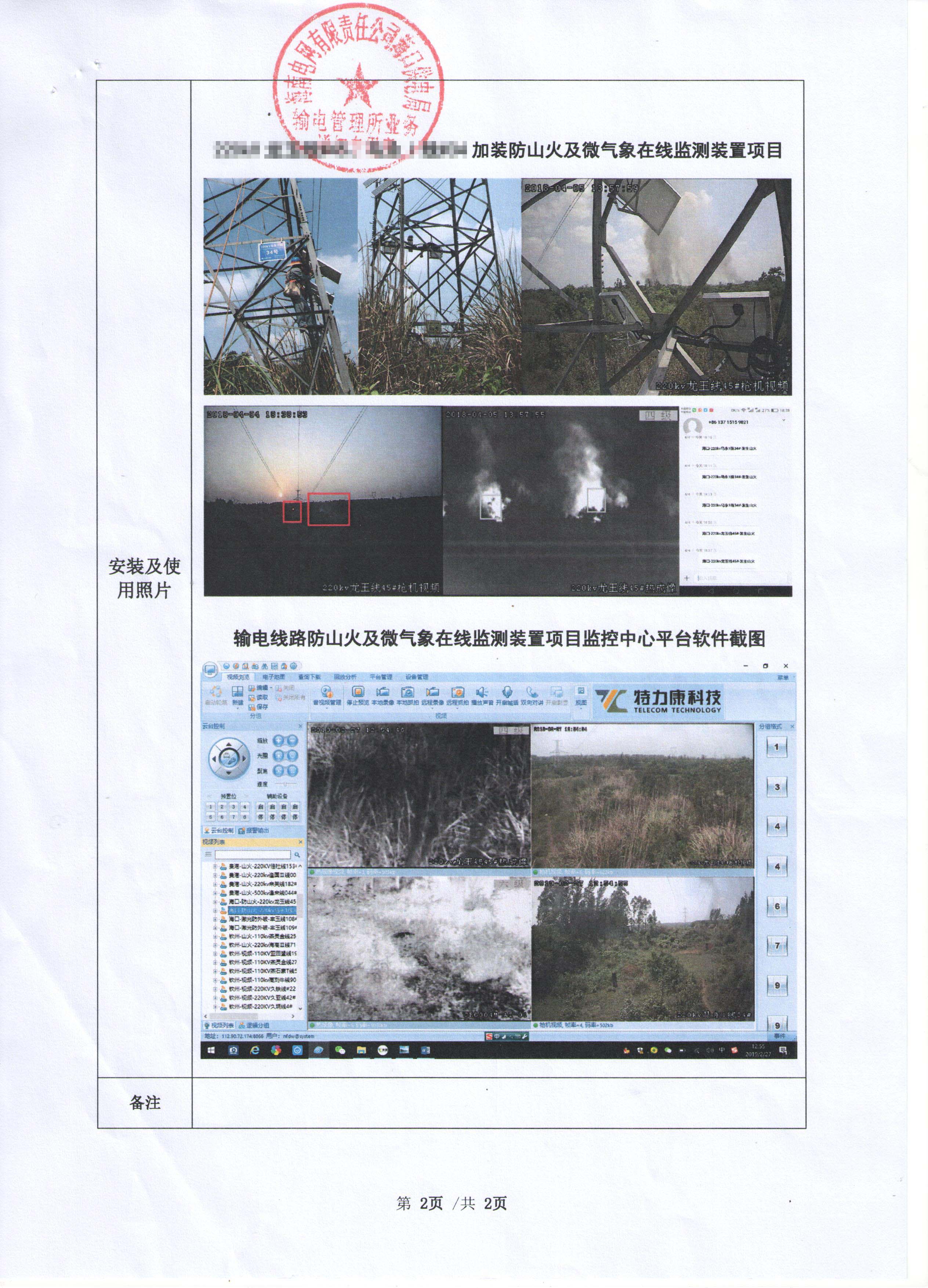 2018年1月26日??诠╇妴挝辉谳爡^(qū)管理線路安裝我司(深圳市特力康科技有限公司)輸電線路防外破裝置,該裝置應(yīng)局方要求加裝了微氣象監(jiān)測裝置及防山火裝置,監(jiān)測塔桿線路走廊以及周邊森林區(qū)域山火情況。