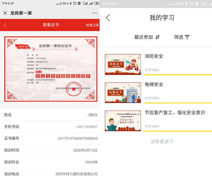 另外,防控期間為確保復(fù)工安全,我司全員進(jìn)行了“龍崗第一課學(xué)習(xí)平臺(tái)”的培訓(xùn)及“強(qiáng)安APP”的《節(jié)后復(fù)產(chǎn)復(fù)工,強(qiáng)化安全意識(shí)》的學(xué)習(xí)、考試、考證。