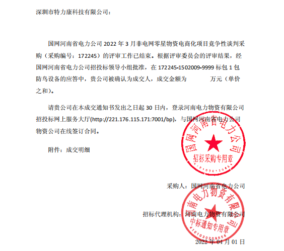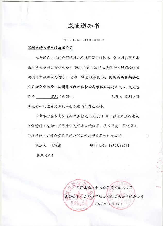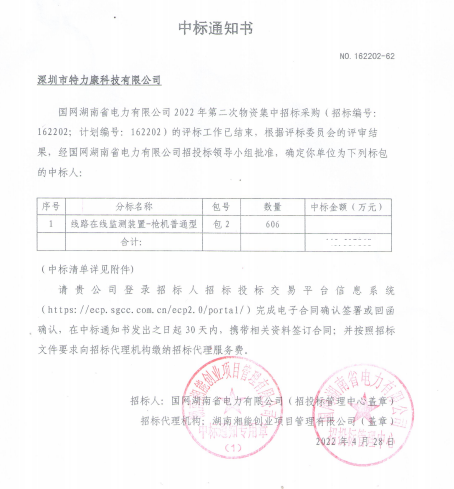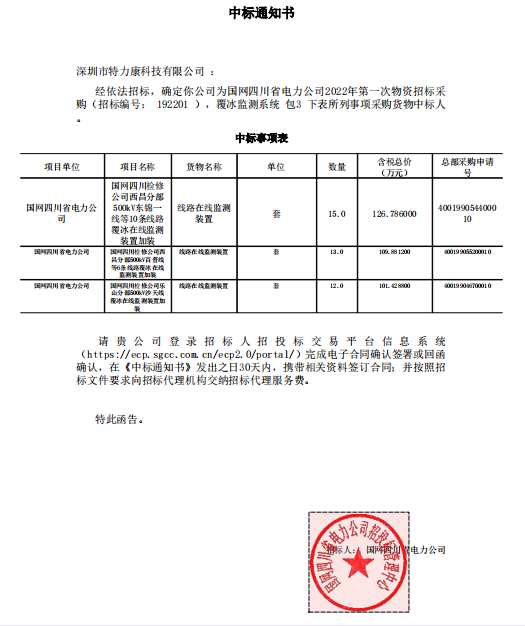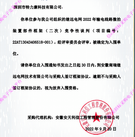 特力康中標(biāo)國(guó)網(wǎng)黑龍江送變電工程公司的2024年度第18次物資類競(jìng)爭(zhēng)性談判采購(gòu)項(xiàng)目——慶陽(yáng)驅(qū)鳥器物資框 特力康中標(biāo)國(guó)網(wǎng)甘肅省電力公司省管產(chǎn)業(yè)單位2024年第五次物資競(jìng)爭(zhēng)性談判授權(quán)采購(gòu)項(xiàng)目 中標(biāo)喜訊:深圳市特力康科技有限公司成功入圍許繼集團(tuán)綜合能源公司輸電線路視頻在線監(jiān)測(cè)裝置模塊集采項(xiàng)目 中標(biāo)喜訊:特力康成功中標(biāo)國(guó)網(wǎng)重慶市電力公司渝中一片區(qū)項(xiàng)目 特力康成功中標(biāo)國(guó)網(wǎng)天津市電力公司2024年第二次?物?資招標(biāo)項(xiàng)目 特力康中標(biāo)國(guó)網(wǎng)安徽省電力有限公司蕪湖供電公司2024年3月非物質(zhì)采購(gòu)項(xiàng)目 四川電力用特力康架空輸電線路山火監(jiān)測(cè)裝置,筑牢林區(qū)輸電 “防火墻”? 遼寧電力啟用特力康多視角監(jiān)拍裝置,全維度守護(hù)輸電安全? 破解黃土高原沉降難題:山西電力用特力康北斗裝置守桿塔安全? 山東電力啟用特力康動(dòng)態(tài)版智能激光驅(qū)鳥器,動(dòng)態(tài)防控守護(hù)變電站安全? 湖南超高壓電力啟用特力康球機(jī) AI 監(jiān)測(cè)裝置,智能守護(hù)輸電通道安全? 廣西電力啟用特力康高壓電纜護(hù)層環(huán)流監(jiān)控設(shè)備,筑牢電纜安全防線? 山東電力用上特力康綜合驅(qū)鳥器,多手段守護(hù)變電站安全? 陜西電力啟用特力康智能預(yù)警系統(tǒng),多維監(jiān)測(cè)守護(hù)輸電安全? 寧夏配電線路安裝了我司防外破電子化智能警示牌