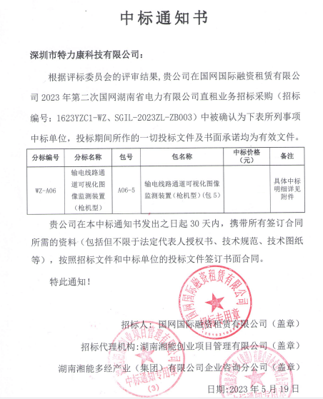 特力康中標2023年第二次國網(wǎng)湖南省電力有限公司直租業(yè)務招標采購可視化圖像監(jiān)測