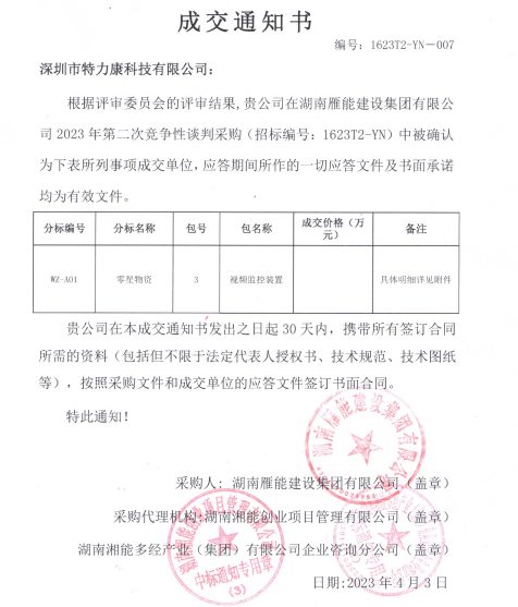 特力康中標(biāo)湖南雁能建設(shè)集團(tuán)有限公司2023年第二次競爭性談判采購零星物資包