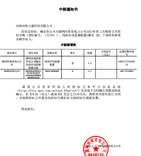 特力康中標國網黑龍江送變電工程公司的2024年度第18次物資類競爭性談判采購項目——慶陽驅鳥器物資框 特力康中標國網甘肅省電力公司省管產業(yè)單位2024年第五次物資競爭性談判授權采購項目 中標喜訊:深圳市特力康科技有限公司成功入圍許繼集團綜合能源公司輸電線路視頻在線監(jiān)測裝置模塊集采項目 中標喜訊:特力康成功中標國網重慶市電力公司渝中一片區(qū)項目 特力康成功中標國網天津市電力公司2024年第二次?物?資招標項目 特力康中標國網安徽省電力有限公司蕪湖供電公司2024年3月非物質采購項目 四川電力用特力康架空輸電線路山火監(jiān)測裝置,筑牢林區(qū)輸電 “防火墻”? 遼寧電力啟用特力康多視角監(jiān)拍裝置,全維度守護輸電安全? 破解黃土高原沉降難題:山西電力用特力康北斗裝置守桿塔安全? 山東電力啟用特力康動態(tài)版智能激光驅鳥器,動態(tài)防控守護變電站安全? 湖南超高壓電力啟用特力康球機 AI 監(jiān)測裝置,智能守護輸電通道安全? 廣西電力啟用特力康高壓電纜護層環(huán)流監(jiān)控設備,筑牢電纜安全防線? 山東電力用上特力康綜合驅鳥器,多手段守護變電站安全? 陜西電力啟用特力康智能預警系統,多維監(jiān)測守護輸電安全? 寧夏配電線路安裝了我司防外破電子化智能警示牌