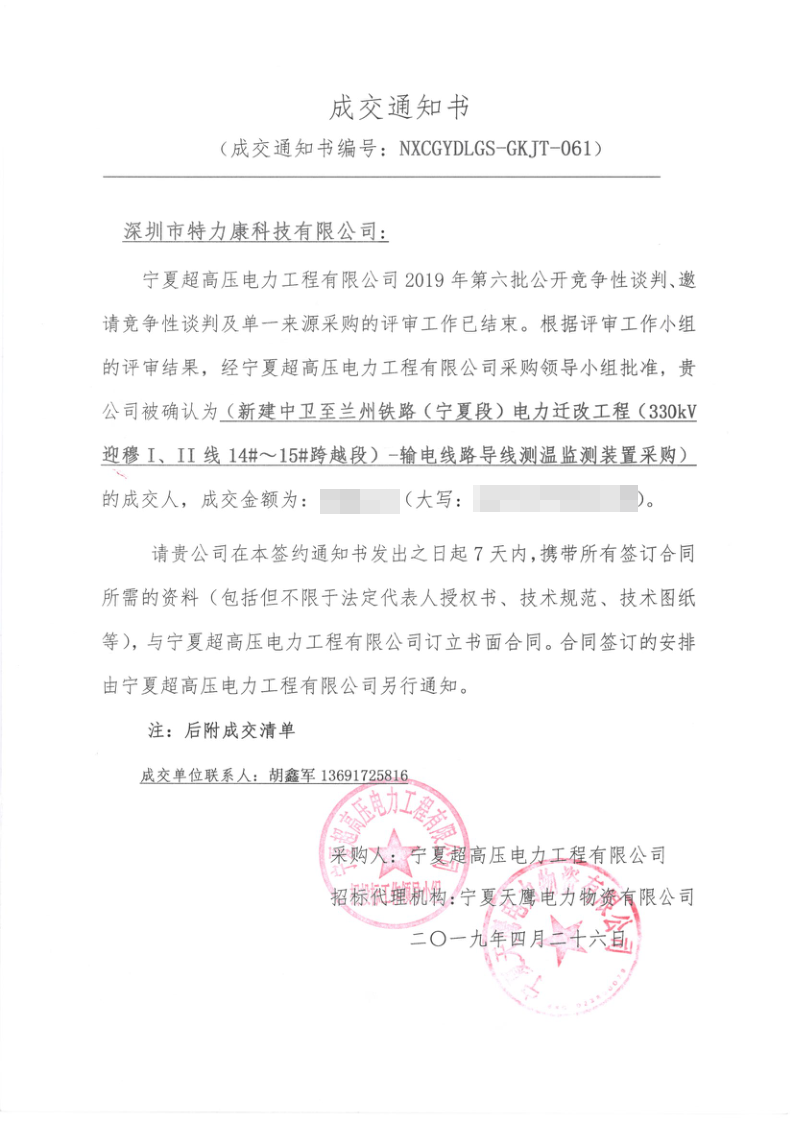 寧夏超高壓局2019年第六批公開(kāi)競(jìng)爭(zhēng)性談判電力遷改項(xiàng)目評(píng)審工作已結(jié)束,經(jīng)評(píng)審委員會(huì)評(píng)審,經(jīng)寧夏超高壓局招投標(biāo)領(lǐng)導(dǎo)小組批準(zhǔn),我司被確定為此項(xiàng)目簽約單位現(xiàn)將公告公示。
