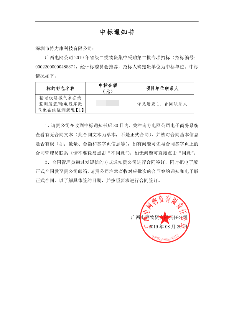 廣西電網(wǎng)公司 2019 年省級二類物資集中采購第二批專項(xiàng)招標(biāo)項(xiàng)目評審工作已結(jié)束,經(jīng)評標(biāo)委員會推薦,招標(biāo)人確定我司為中標(biāo)單位。