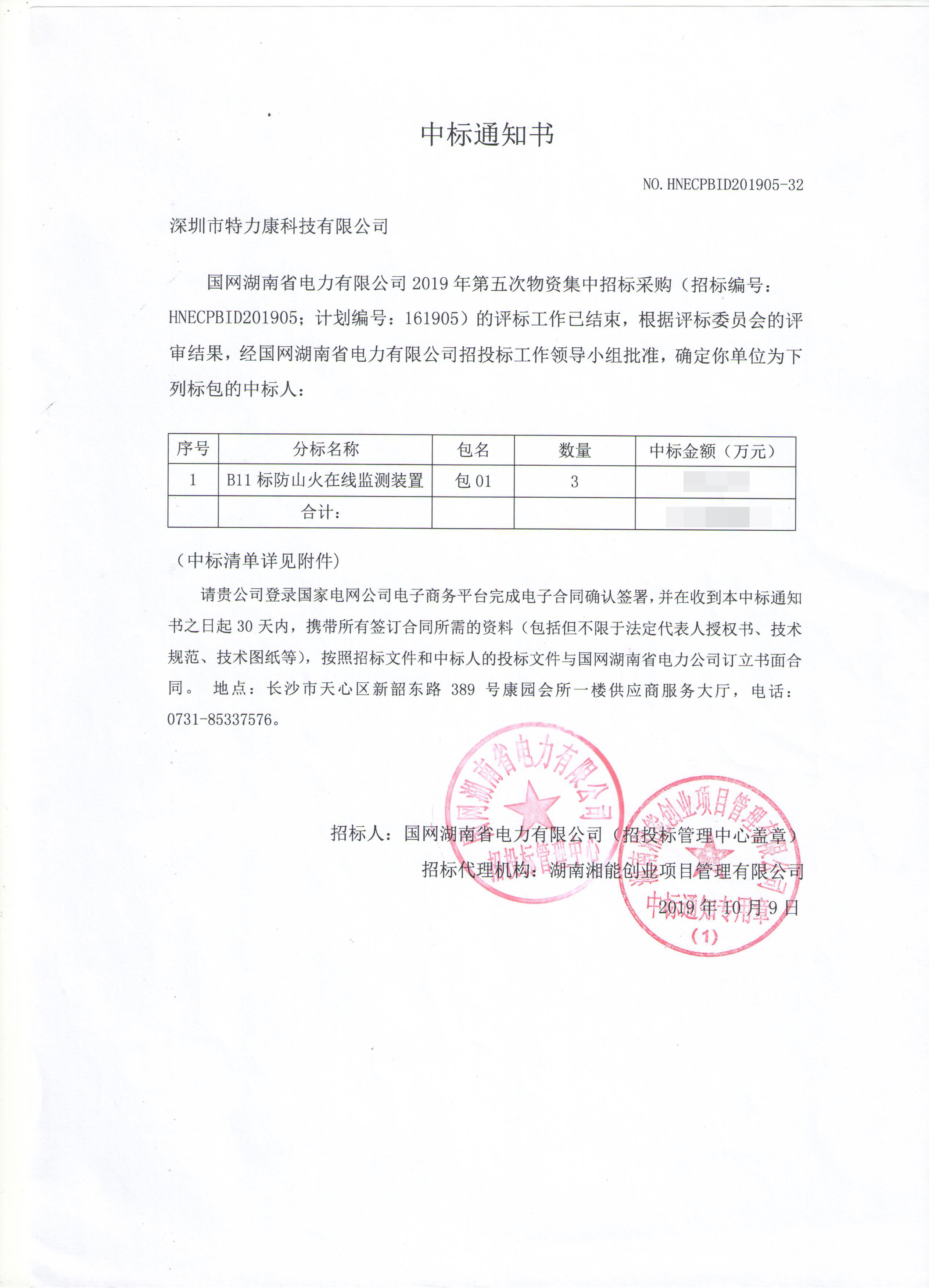 國(guó)網(wǎng)湖南省電力有限公司2019年第五次物資集中招標(biāo)輸電線路防山火監(jiān)測(cè)裝置的評(píng)標(biāo)工作已結(jié)束,根據(jù)評(píng)標(biāo)審結(jié)果,經(jīng)國(guó)網(wǎng)湖南省電力有限公司招投標(biāo)工作領(lǐng)導(dǎo)小組批準(zhǔn),確定我司深圳市特力康科技有限公司為列標(biāo)包的中標(biāo)人。