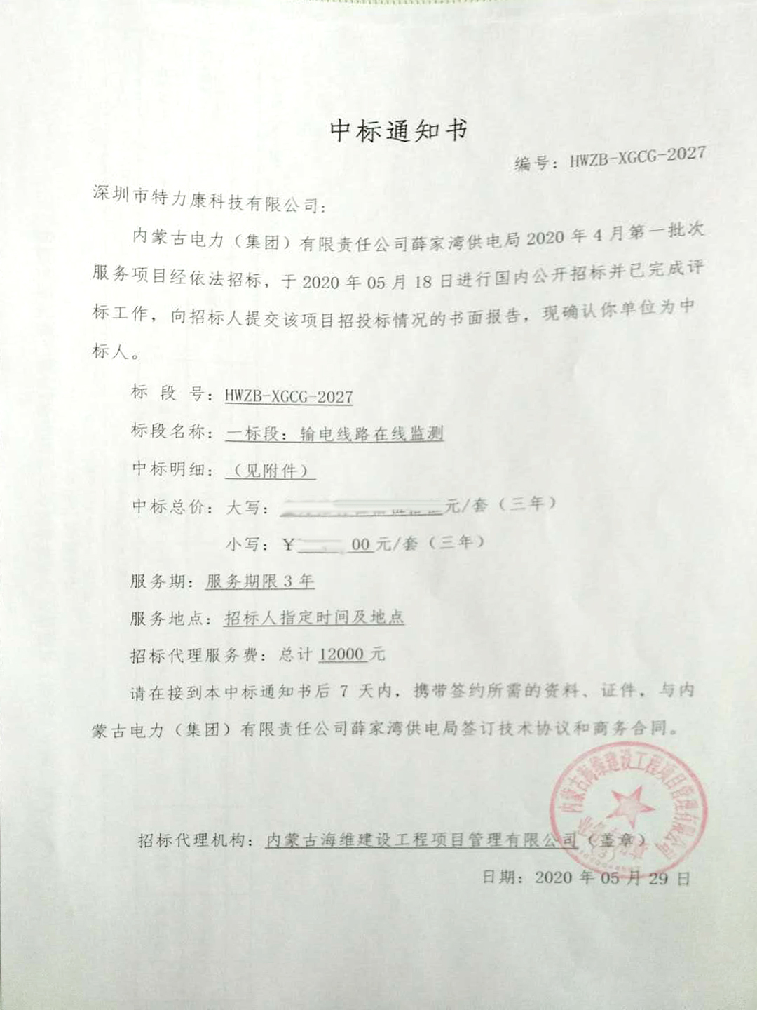 內(nèi)蒙古電力(集團(tuán))有限責(zé)任公司薛家灣供電局2020年4月第一批次服務(wù)項目(一標(biāo)段:輸電線路在線監(jiān)測)經(jīng)依法招標(biāo),于2020年05月18日進(jìn)行國內(nèi)公開招標(biāo)并已完成評標(biāo)工作,向招標(biāo)人提交該項目招投標(biāo)情況的書面報告,現(xiàn)確認(rèn)我司(深圳市特力康科技有限公司)為中標(biāo)人。特發(fā)中標(biāo)通知書,如下: