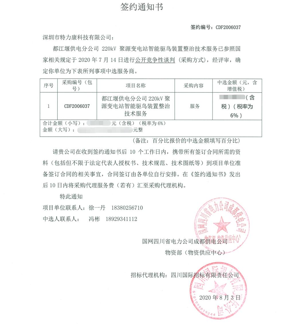 2020年7月14日我司(深圳市特力康科技有限公司)參加的都江堰供電分公司220kV聚源變電站智能驅鳥裝置整治技術服務,已參照國家相關規(guī)定進行公開競爭性談判(采購方式),后經專家評審,確定我司為都江堰供電分公司220kV聚源變電站智能驅鳥裝置整治技術服務中選服務商。特發(fā)簽約通知書如下: