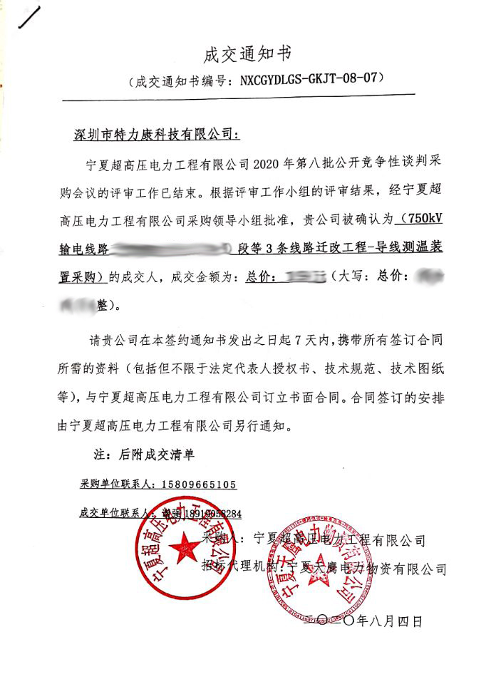 寧夏超高壓電力工程有限公司2020年第八批公開競爭性談判采購會議的評審工作已結(jié)束。根據(jù)評審工作小組的評審結(jié)果,經(jīng)寧夏超高壓電力工程有限公司采購領導小組批準,我司(深圳市特力康科技有限公司)被確認為_ (750kV輸電線路中3條線路遷改工程-導線測溫裝置采購)的成交人,現(xiàn)發(fā)布成交通知書如下: