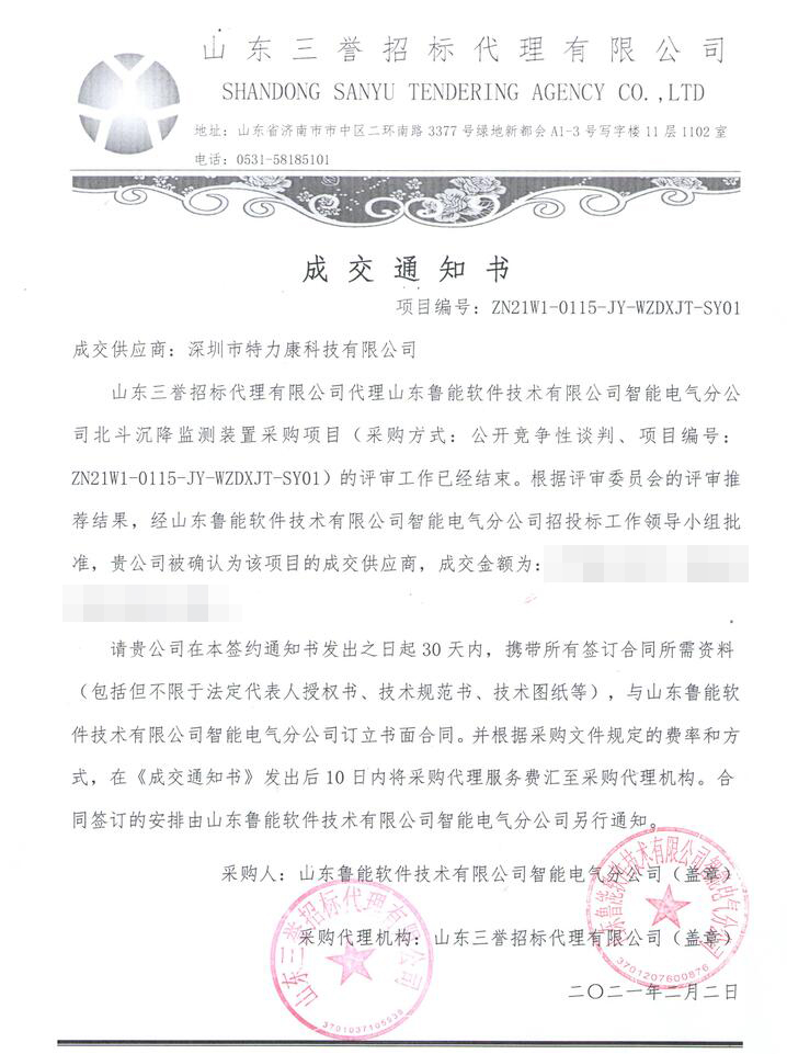 本次山東三譽(yù)招標(biāo)代理有限公司代理山東魯能軟件技術(shù)有限公司智能電氣分公司北斗沉降監(jiān)測裝置采購項(xiàng)目(采購方式:公開競爭性談判、項(xiàng)目編號(hào):ZN21W1-0115-JY-WZDXJT-SY01)的評(píng)審工作已經(jīng)結(jié)束。根據(jù)評(píng)審委員會(huì)的評(píng)審?fù)扑]結(jié)果,經(jīng)山東魯能軟件技術(shù)有限公司智能電氣分公司招投標(biāo)工作領(lǐng)導(dǎo)小組批準(zhǔn),我司(深圳市特力康科技有限公司)被確認(rèn)為該項(xiàng)目的成交供應(yīng)商,成交通知如下: