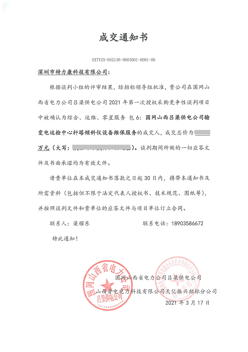 根據(jù)談判小組的評審結(jié)果,經(jīng)招標(biāo)領(lǐng)導(dǎo)組批準(zhǔn),貴公司在國網(wǎng)山西省電力公司呂梁供電公司2021年第一次授權(quán)采購競爭性談判項目中被確認(rèn)為綜合、運維、零星服務(wù)包6:國網(wǎng)山西呂梁供電公司輸變電運檢中心桿塔傾斜儀設(shè)備維保服務(wù)的成交人,成交通知如下: