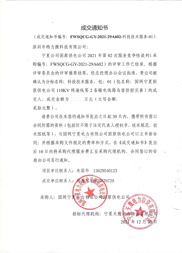 寧夏公司固原供電公司2021年第02次服務(wù)競爭性談判(采購編號: FWSQCG-GY-2021-29A602) 的評審工作已結(jié)束。根據(jù)評審委員會的評審?fù)扑]結(jié)果,經(jīng)總經(jīng)理辦公會議批準(zhǔn),貴公司被確認(rèn)為分標(biāo)名稱:科技技術(shù)服務(wù),包: 01 (包名稱:國網(wǎng)寧夏固原供電公司110KV將渝線等2條輸電線路鳥害防控完善)的成交人,成交通知如下: