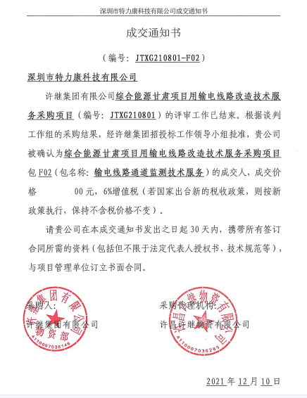 許繼集團有限公司綜合能源甘肅項目用輸電線路改造技術(shù)服務(wù)采購項且(編號: JTXG210801) 的評審工作已結(jié)束。根據(jù)談判工作組的采購結(jié)果,經(jīng)許北集團招投標(biāo)工作領(lǐng)導(dǎo)小組批準(zhǔn)。我司被確認(rèn)為綜合能源甘肅項目用輸電線路改造技術(shù)服務(wù)采購項目包F02(包名稱:輸電線路通道監(jiān)測技術(shù)服務(wù))的成交人,成交通知如下: