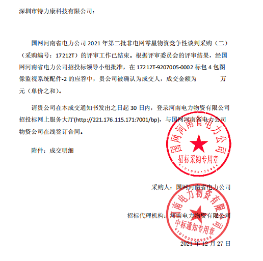 國網河南省電力公司2021年第二批非電網零星物資競爭性談判采購(二)(采購編號: 17212T) 的評審工作已結束。根據評審委員會的評審結果。經國網河南省電力公司招投標領導小組批準,在172127-9207005-0002標包4包圖像監(jiān)視系統配件-2的應答中。貴公司被確認為成交人,成交通知如下: