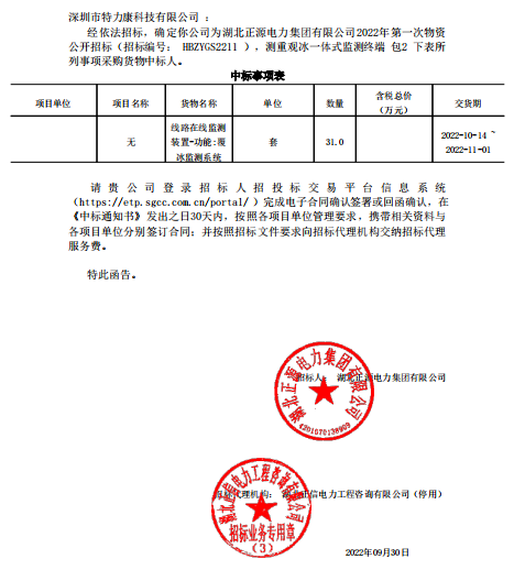 經(jīng)依法招標(biāo),確定我司為湖北正源電力集團(tuán)有限公司2022年第一次物資公開招標(biāo)(招標(biāo)編號(hào): HBZYGS2211 ),測重觀冰一體式監(jiān)測終端包2下表所列事項(xiàng)采購貨物中標(biāo)人。中標(biāo)通知如下: