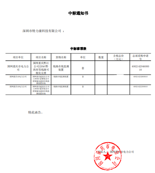 我司(深圳市特力康科技有限公司)中標國網(wǎng)重慶市電力公司2023年第二次物資公開招標采購-線路在線監(jiān)測裝置-可視化(架空),中標通知如下: