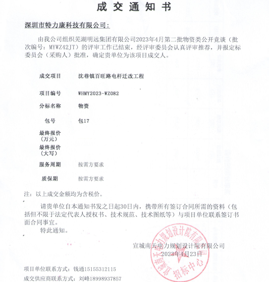 特力康中標(biāo)國網(wǎng)黑龍江送變電工程公司的2024年度第18次物資類競(jìng)爭(zhēng)性談判采購項(xiàng)目——慶陽驅(qū)鳥器物資框 特力康中標(biāo)國網(wǎng)甘肅省電力公司省管產(chǎn)業(yè)單位2024年第五次物資競(jìng)爭(zhēng)性談判授權(quán)采購項(xiàng)目 中標(biāo)喜訊:深圳市特力康科技有限公司成功入圍許繼集團(tuán)綜合能源公司輸電線路視頻在線監(jiān)測(cè)裝置模塊集采項(xiàng)目 中標(biāo)喜訊:特力康成功中標(biāo)國網(wǎng)重慶市電力公司渝中一片區(qū)項(xiàng)目 特力康成功中標(biāo)國網(wǎng)天津市電力公司2024年第二次?物?資招標(biāo)項(xiàng)目 特力康中標(biāo)國網(wǎng)安徽省電力有限公司蕪湖供電公司2024年3月非物質(zhì)采購項(xiàng)目 四川電力用特力康架空輸電線路山火監(jiān)測(cè)裝置,筑牢林區(qū)輸電 “防火墻”? 遼寧電力啟用特力康多視角監(jiān)拍裝置,全維度守護(hù)輸電安全? 破解黃土高原沉降難題:山西電力用特力康北斗裝置守桿塔安全? 山東電力啟用特力康動(dòng)態(tài)版智能激光驅(qū)鳥器,動(dòng)態(tài)防控守護(hù)變電站安全? 湖南超高壓電力啟用特力康球機(jī) AI 監(jiān)測(cè)裝置,智能守護(hù)輸電通道安全? 廣西電力啟用特力康高壓電纜護(hù)層環(huán)流監(jiān)控設(shè)備,筑牢電纜安全防線? 山東電力用上特力康綜合驅(qū)鳥器,多手段守護(hù)變電站安全? 陜西電力啟用特力康智能預(yù)警系統(tǒng),多維監(jiān)測(cè)守護(hù)輸電安全? 寧夏配電線路安裝了我司防外破電子化智能警示牌